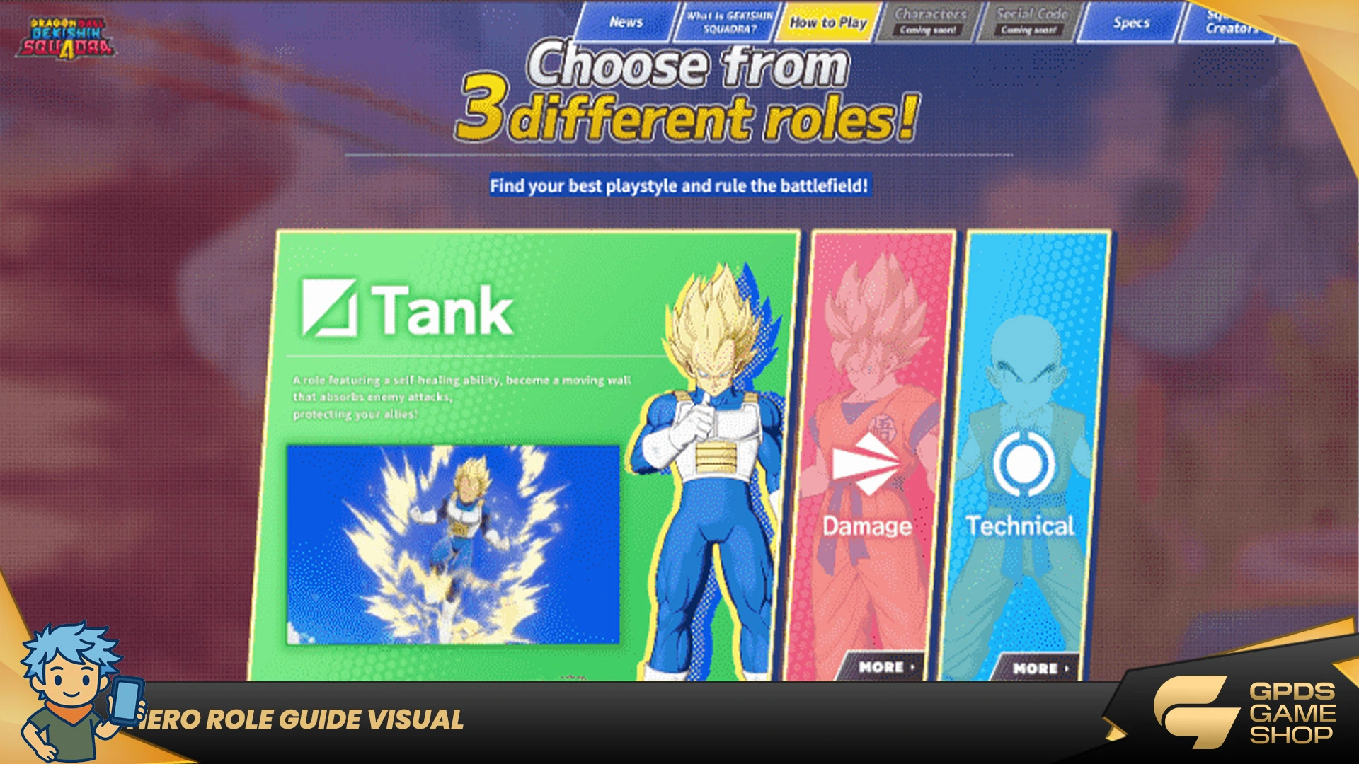 At its heart, Dragon Ball Gekishin Squadra is about tactical chaos. Two teams of four enter the arena, each controlling a Dragon Ball hero with a unique role — Tank, Damage, or Technical. Tanks stand tall against massive attacks, Damage heroes crush opponents with high power combos, and Technical units heal, shield, and outsmart enemies through support play.