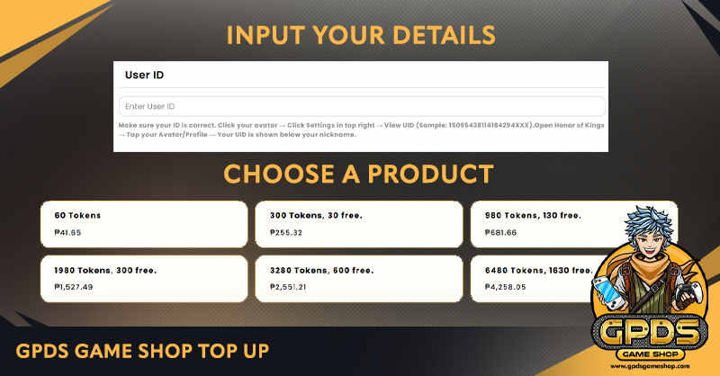 Through trusted sellers like GPDS Game Shop. Simply enter your ID and server, choose tokens or passes, and pay via Maya, GCash, or bank transfers.