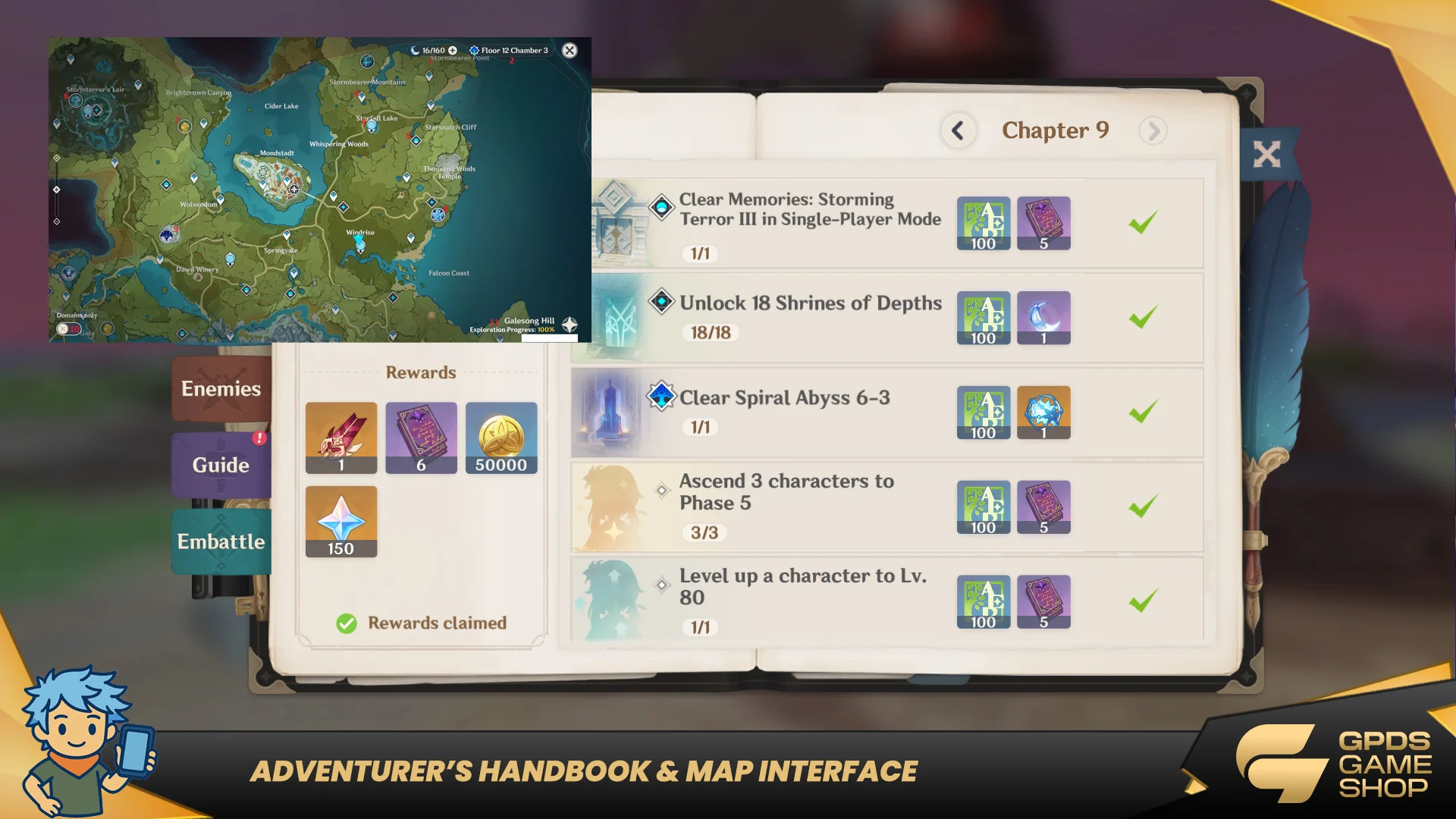 The Adventurer’s Handbook tracks bosses, farming materials, and Adventure Rank EXP goals. Whenever you’re unsure what to do next, open it. It’s your built-in Genshin Impact guide for daily progression.
