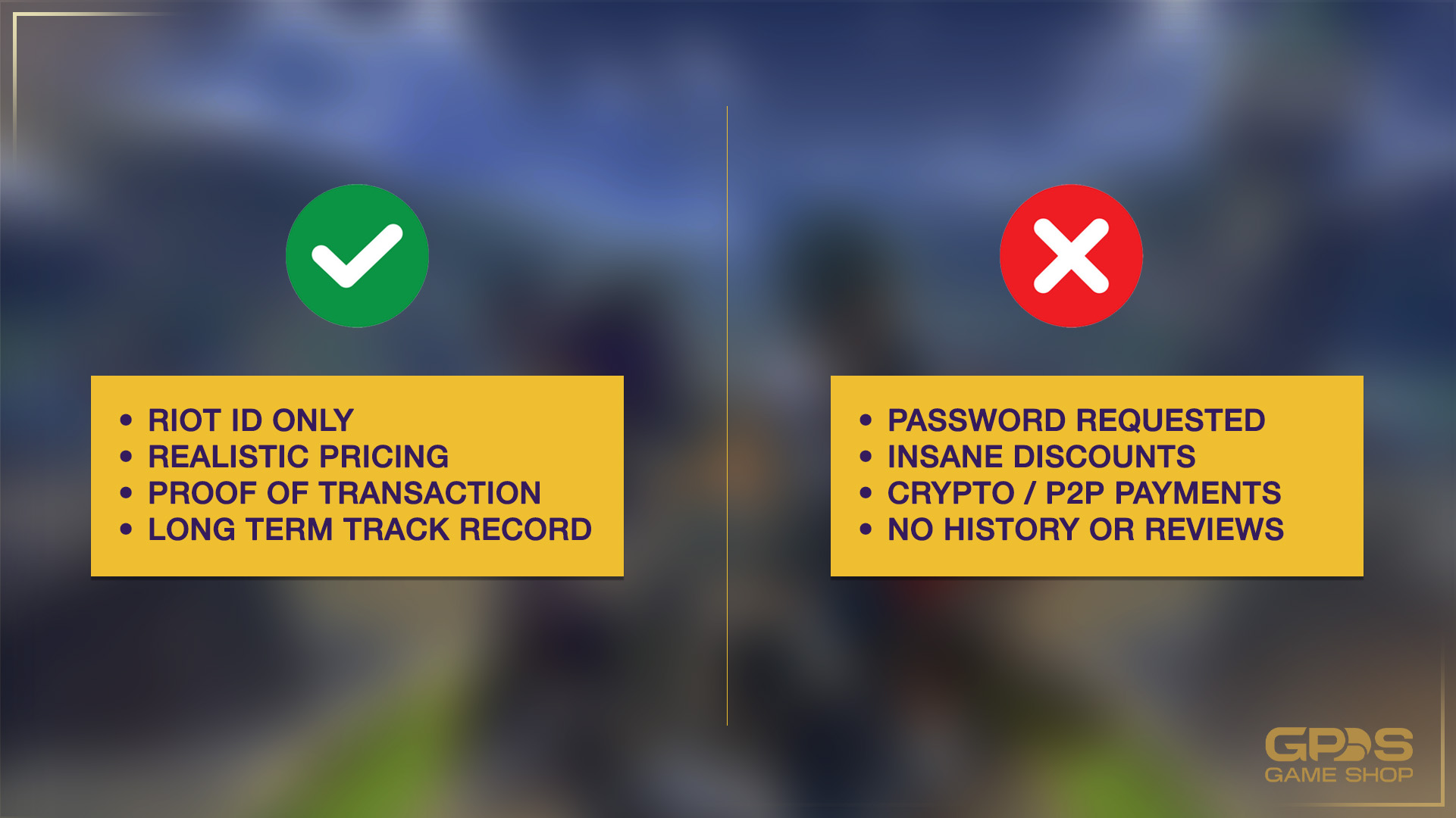 - Asks for your password: A safe transaction only requires your Riot ID (Username#Tagline). Anyone asking for your password intends to steal your account.